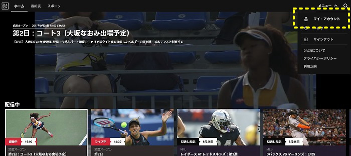 まずDAZNにログインした状態でマイページ右上の「メニュー」>「マイ・アカウント」をクリック。