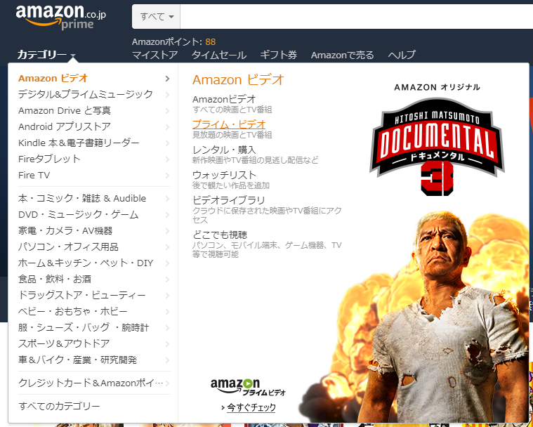動画を見るには、「カテゴリー」→「Amazonビデオ」→「プライム・ビデオ」と進みます。