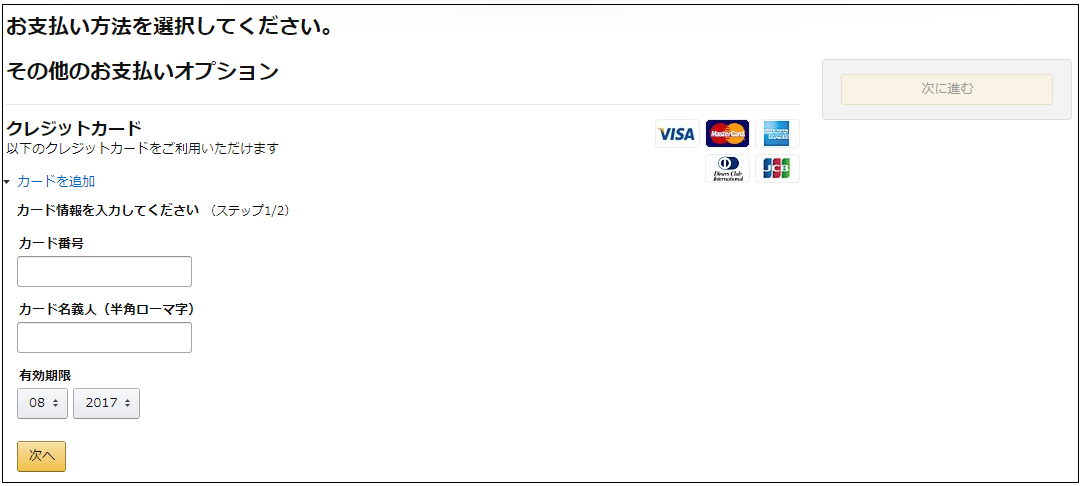 支払方法・住所登録の画面に移ります(既に登録している方は省略されます)。画面に行くと分かりますが、「クレジット支払」しか選択することができません。