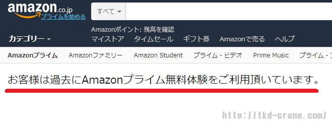 Amazonプライム無料体験の利用は1人一回まで。マナー・モラルとしても当然ですが、登録しようとしても上記のような画像が現れます。